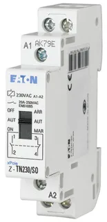 Instalační relé s mechanickou předvolbou funkce, trvalé ZAP / AUTOM / VYP, řídicí napětí 230V 50Hz, funkce: 2 spínací kontakt, jmenovitý povozní proud 20 A, 250V AC, provedení dle normy IEC/EN 60947, vestavný rozměr víčka 45 mm, šířka při montáži 1HP (17,5 mm), montáž na montážní lištu, průřez svorky 0,5–10 mm² jednodrátový a vícedrátový / 0x5–6 mm² lankový s dutinkou