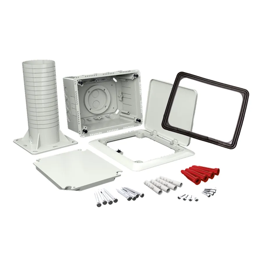 Pro instalaci přístrojů v zateplených fasádách budov tloušťky 120 - 300 mm. Použití pro zabudování elektrických přístrojů, rozvodná krabice a jiné aplikace dle zákazníka. Eliminuje vytváření tepelných mostů. Nastavitelná hloubka krabice. Sestava obsahuje krabici, tubus, vnější a vnitřní izolaci, montážní příbal, otevírací víko, montážní desku a nerezové šrouby. Robusní konstrukce. Chráněno evropským průmyslovým vzorem.