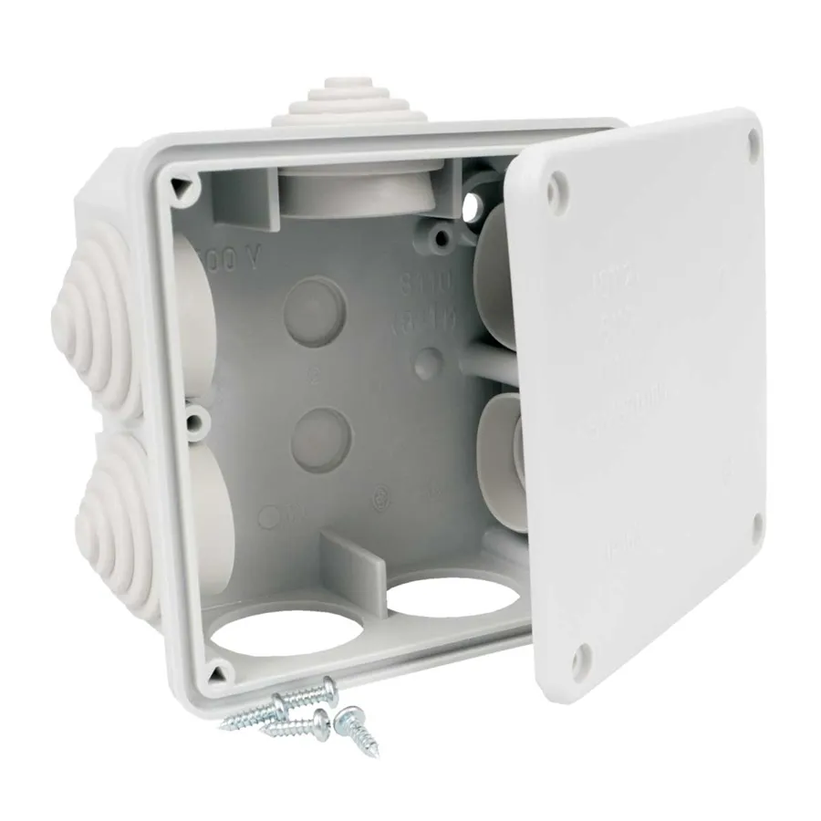 v krabici vloženy průchodky a šrouby pro připevnění víka, každá krabice balena ve smrštitelné fólii a označena štítkem