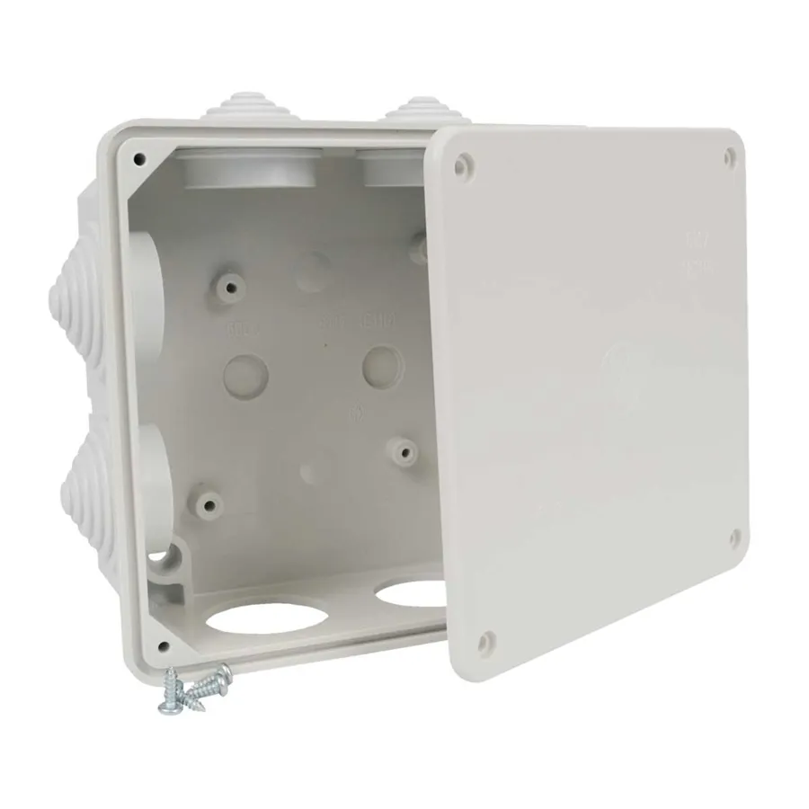 v krabici vloženy průchodky a šrouby pro připevnění víka, každá krabice balena ve smrštitelné fólii a označena štítkem