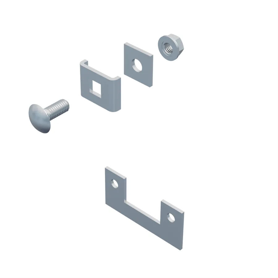 Spojka SZM 4 se používá k vytváření kolen, T-kusů, křížení žlabůa dalších různých odbočení dle potřeby na kabelové trase. Kombinací příložek C nebo D lze docílit různého úhlu postupného oblouku trasy.Sada spojky se skládá z hlavní příložky typu B, příložek typu C a D, šroubu vratového M6x16 a matice límcové M6. Komponenty na tomto obrázku jsou součástí balení. Balení 10x10ks. V sáčku je vždy 5ks doplňkové příložky, která se instaluje s 2x spojkou SZM 4.
