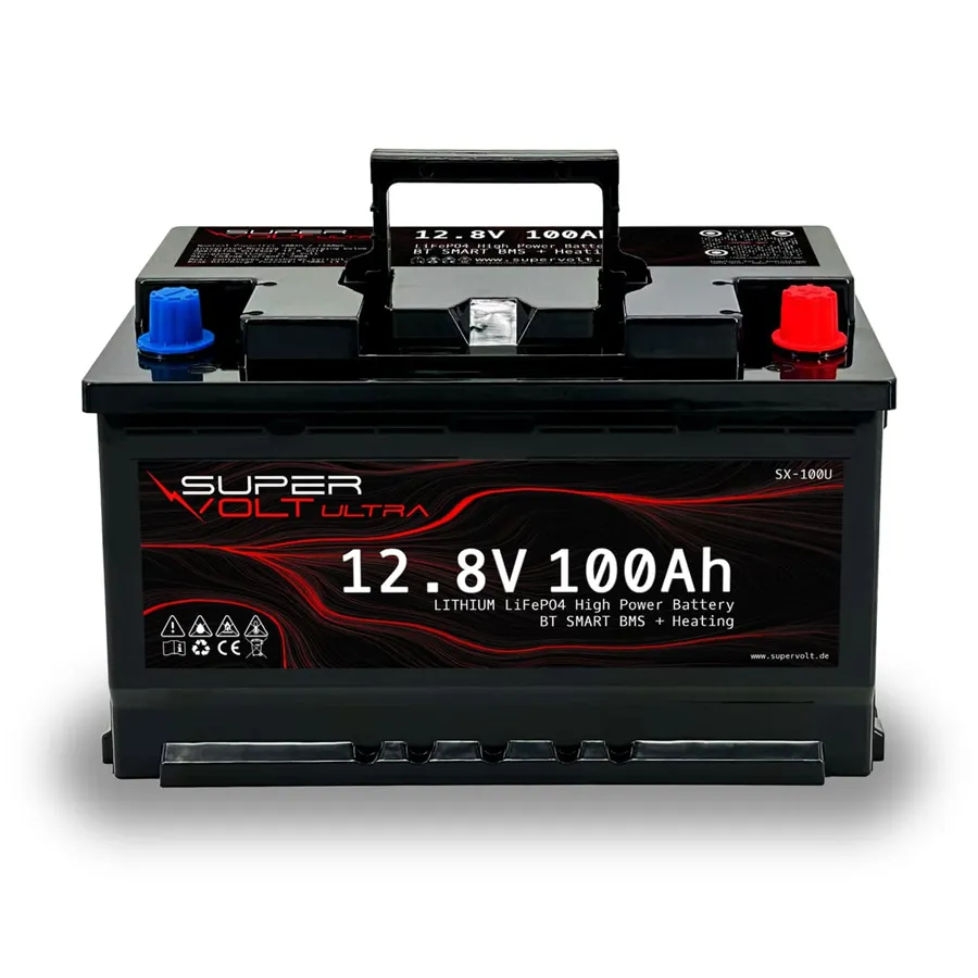 Naše 100ah Supervolt Ultra vysoce výkonná baterie je elektrárna plná inovativních technologií. Tato vysoce výkonná LiFePO4 baterie 12,8 V 100 Ah s hmotností pouhých 10,1 kg představuje významnou úsporu hmotnosti ve srovnání s běžnými olověnými bateriemi.